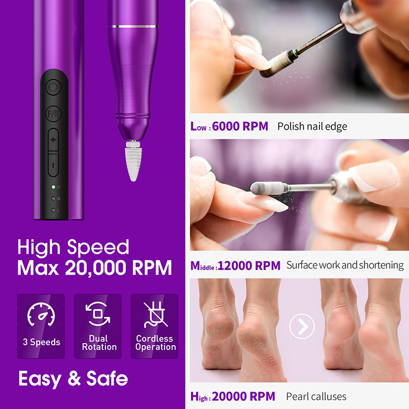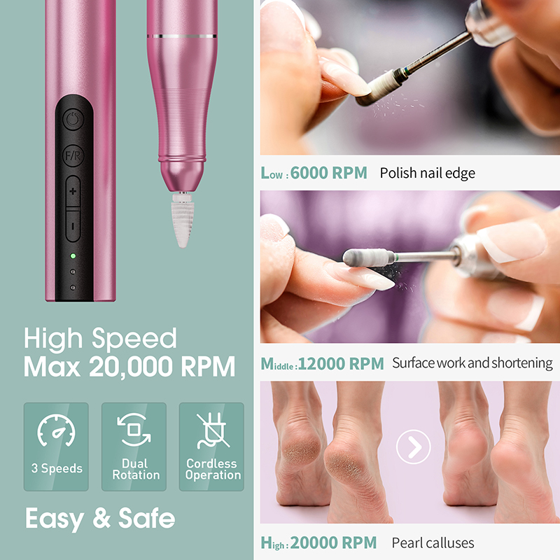 Nagelvijlen professioneel zijn ontworpen met 3 snelheden van 6000-12000-20000, druk gewoon kort op de + of - knop om de snelheid te verhogen of te verlagen. Gemakkelijk de snelheid aan te passen en tijd te besparen bij het slijpen van nagels. De richting van de boor kan eenvoudig worden gewijzigd door op de F/R-knop te drukken, ideaal voor linkshandigen, meester-nagelkunstenaars of beginners in nagelverzorging.