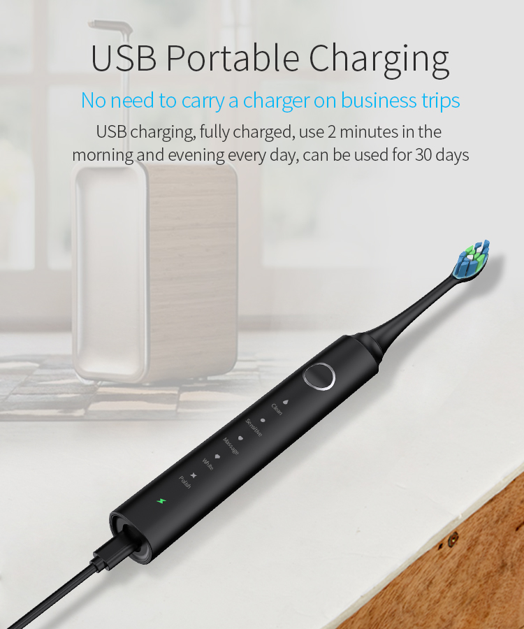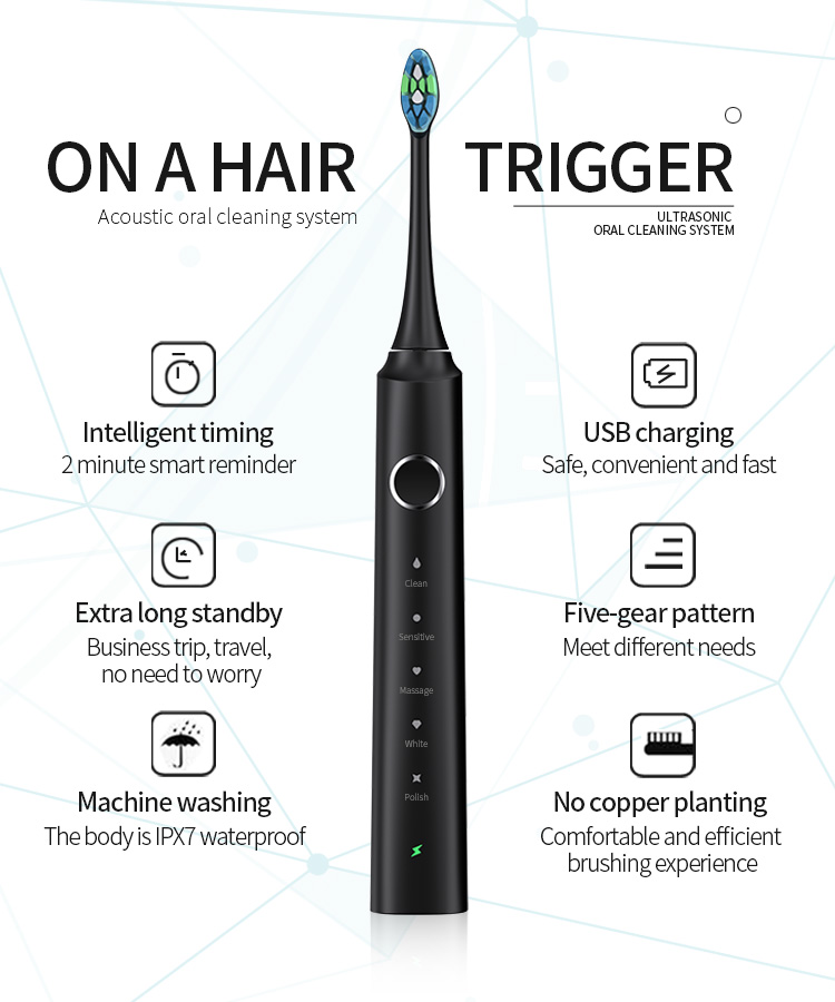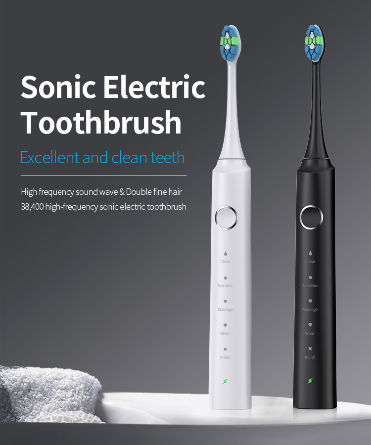 - 5 HOOGWAARDIGE POETSSTANDEN: Schoon (zacht), Wit (sterk), Polijsten (sterke omgekeerde frequentie), Milder (zachte omgekeerde frequentie) en Gevoelig (zacht) om aan de verschillende condities van de tanden en het tandvlees te voldoen. U kunt verschillende standen kiezen op basis van uw voorkeuren en de aanbevelingen van uw tandarts.