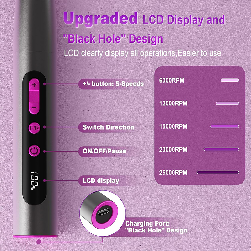 Behuizing van aluminiumlegering met hoogwaardige motor, professionele nagelboor met hoge snelheid en tegelijkertijd efficiënte warmteafvoer. Motor met hoge concentriciteit, sterk en gelijkmatig vermogen, continu lage trillingen, laag geluidsniveau en lage hitte, waardoor uw nagelverzorging efficiënter en comfortabeler wordt.