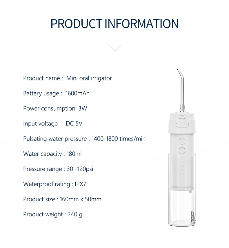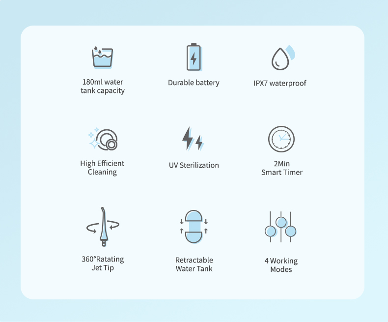 Deze waterflossr-tandheelkundige prikker levert hoge waterdrukpulsen van 1400-1800 keer per minuut, waardoor effectief 99,9% van de tandplak wordt verwijderd voor een diepe reiniging van de tanden. Deze waterflosser-tandheelkundige prikker masseert het tandvlees, bevordert de bloedsomloop en pakt mondproblemen aan zoals slechte adem, orthodontische tanden