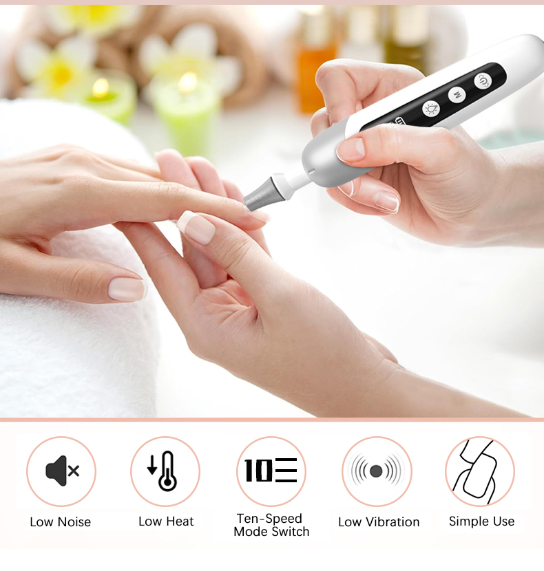 - 10 SNELHEIDSINSTELLINGEN: Ervaar de kracht van onze elektrische manicureset, met 10 progressieve snelheidsinstellingen en veelzijdige rotaties met de klok mee en tegen de klok in. De efile-nagelboor garandeert nauwkeurig vijlen op dikke vinger- en teennagels en is op maat gemaakt voor alle huidtypen, inclusief mensen met diabetes