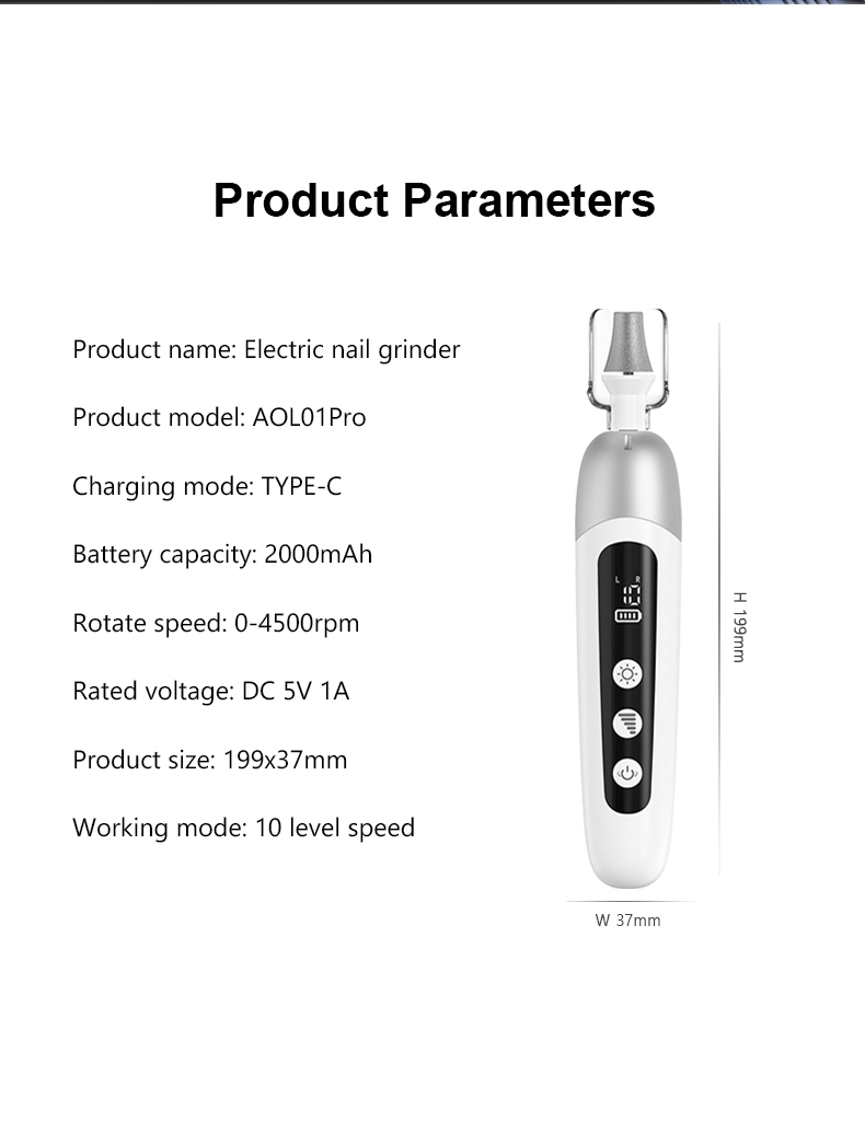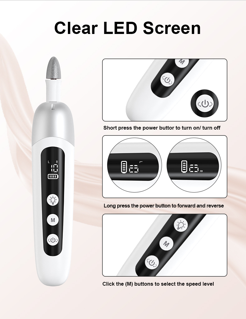 - INNOVATIEVE LED-DISPLAY: Navigeer moeiteloos en naadloos door de gewenste instellingen. De LED-display geeft de batterijstatus, snelheidsvoorkeur en rotatie-instellingen aan voor moeiteloze bediening. De elektrische nagelvijlmachine is ook uitgerust met een geïntegreerd LED-lampje dat gebieden op handen en voeten verlicht