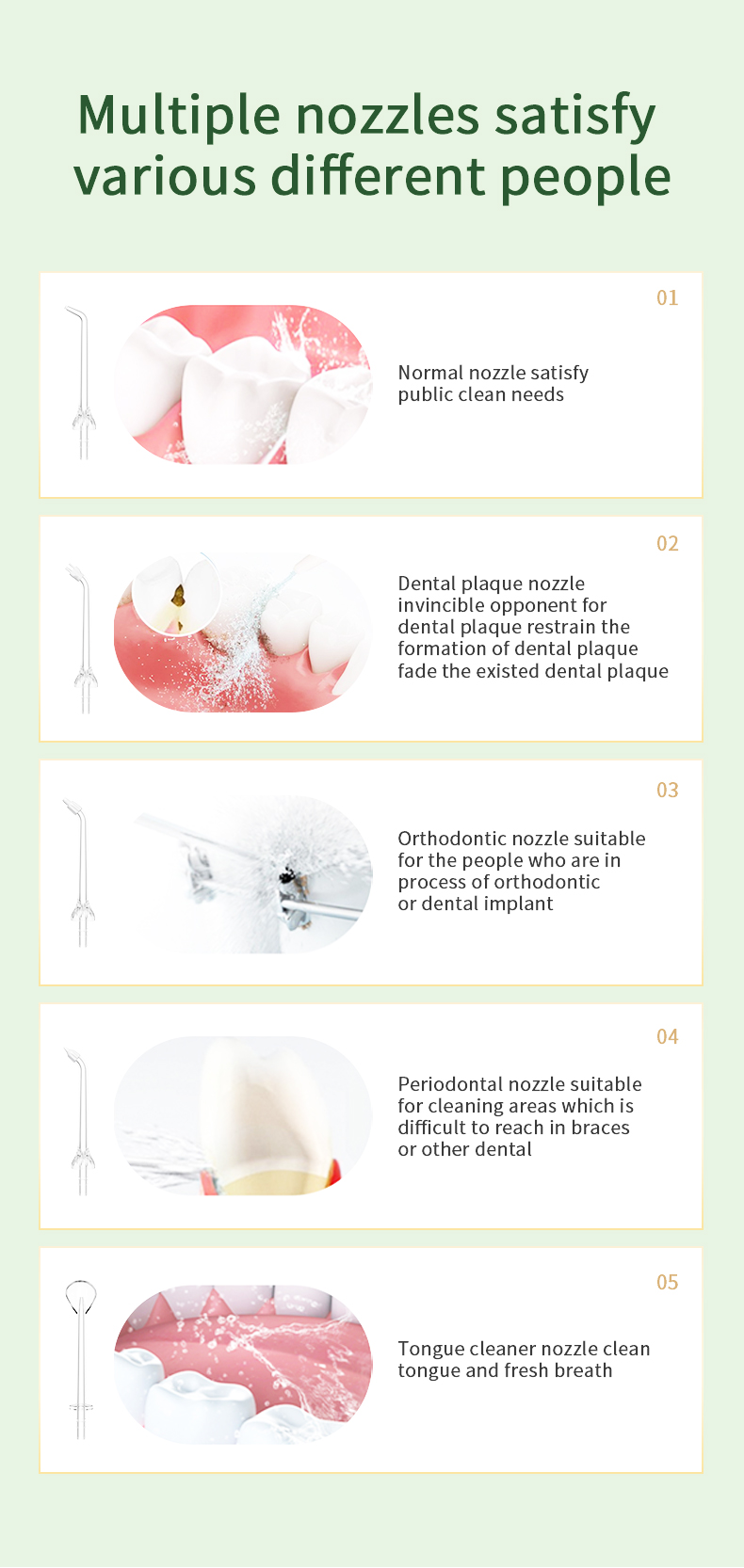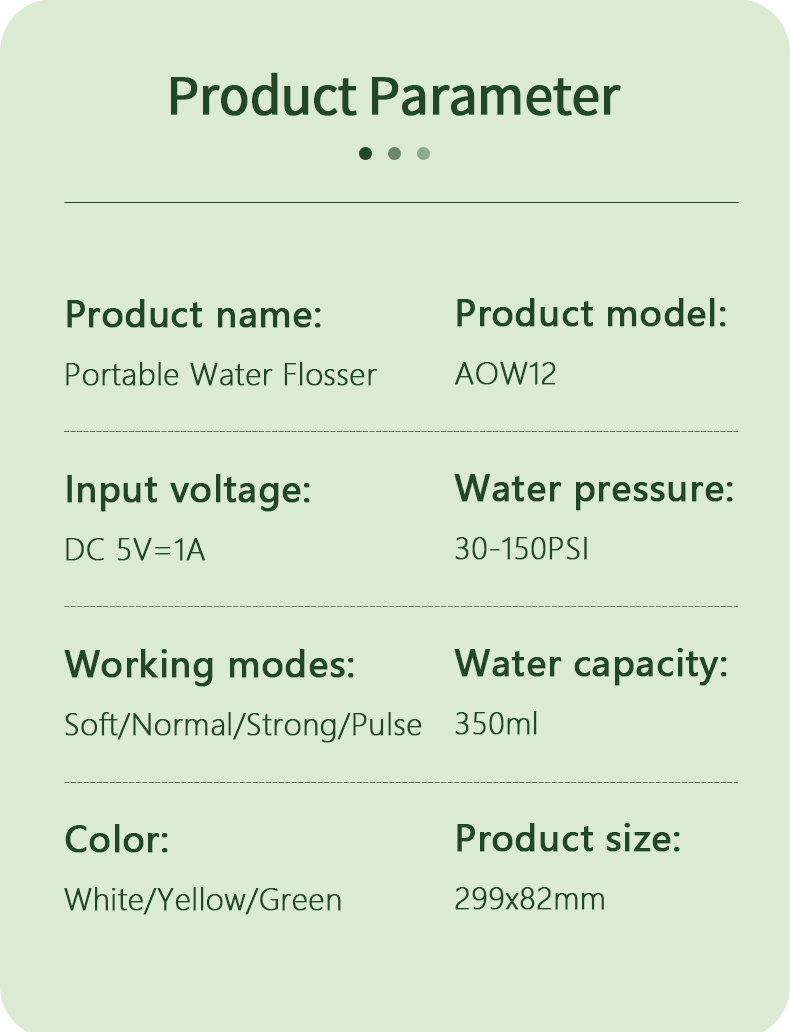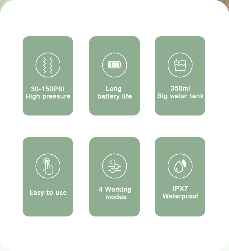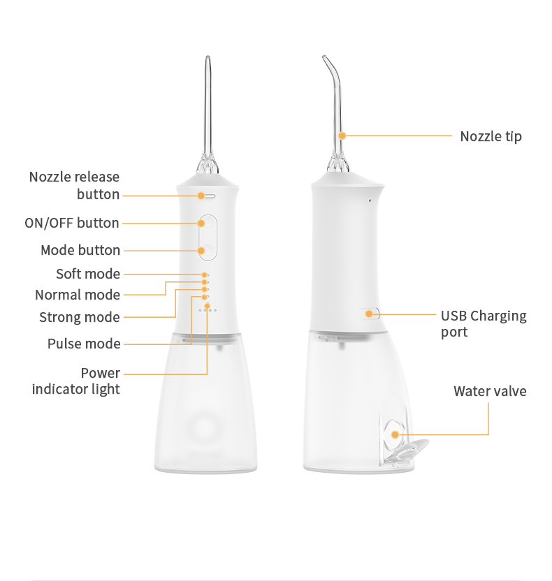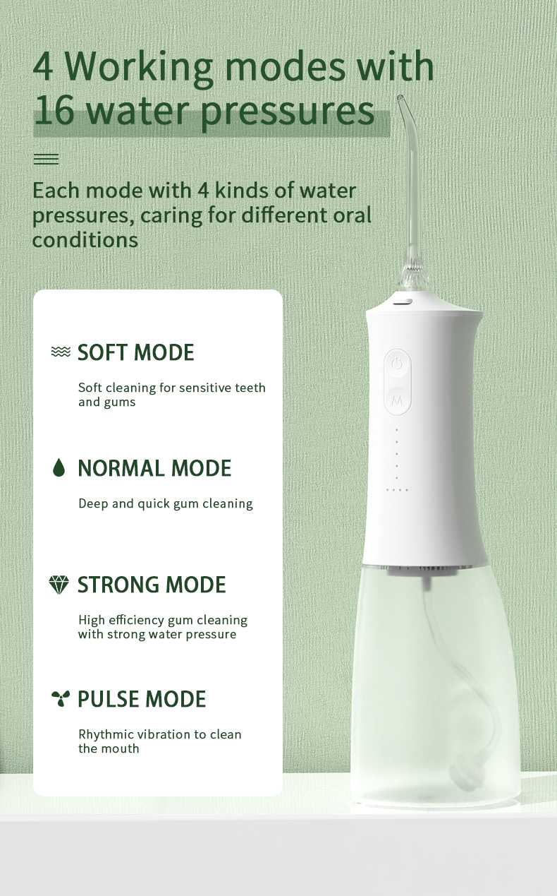 Deze watertandenborstel levert hoge waterdrukpulsen van 1400-1800 keer per minuut, waardoor 99,9% van de tandplak effectief wordt verwijderd voor een diepe tandenreiniging. Deze watertandenborstel masseert het tandvlees, bevordert de bloedcirculatie en pakt orale problemen zoals slechte adem en orthodontische tanden aan