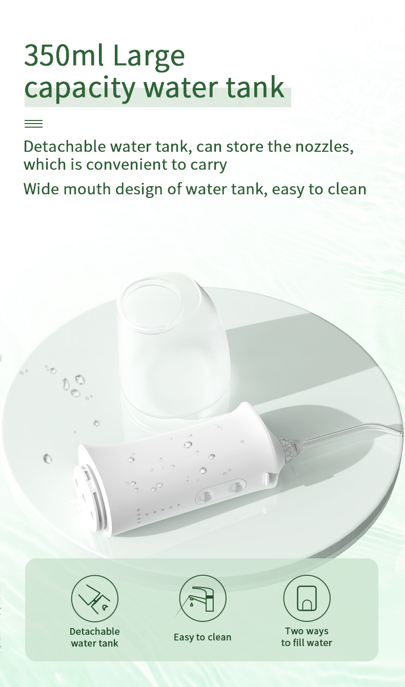 Deze watertandenflosser is voorzien van een verbeterd waterreservoir van 350 ml, tweemaal de capaciteit van andere oude modellen, waardoor het niet meer nodig is om regelmatig bij te vullen en uw mondreiniging handiger en efficiënter maakt